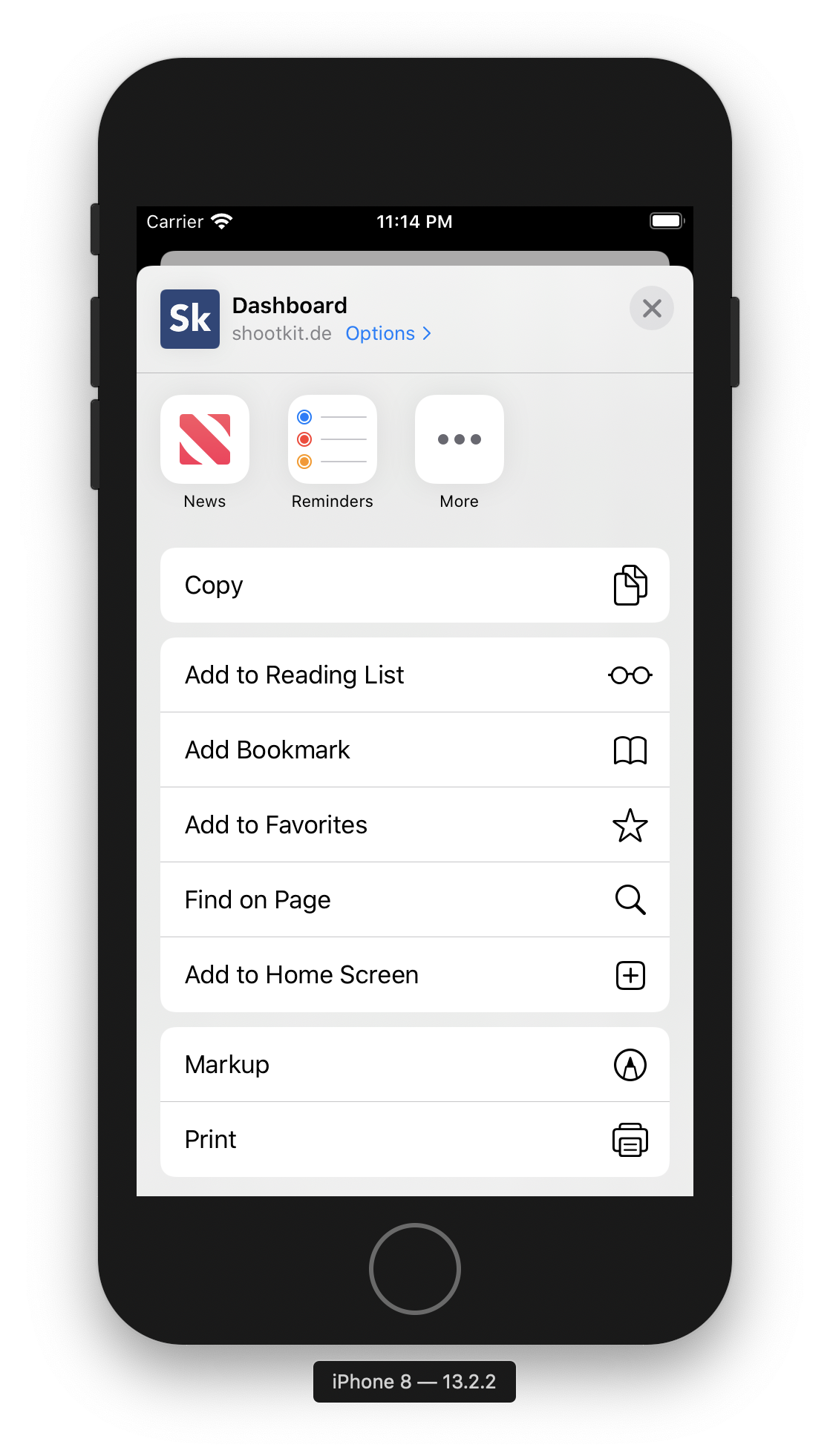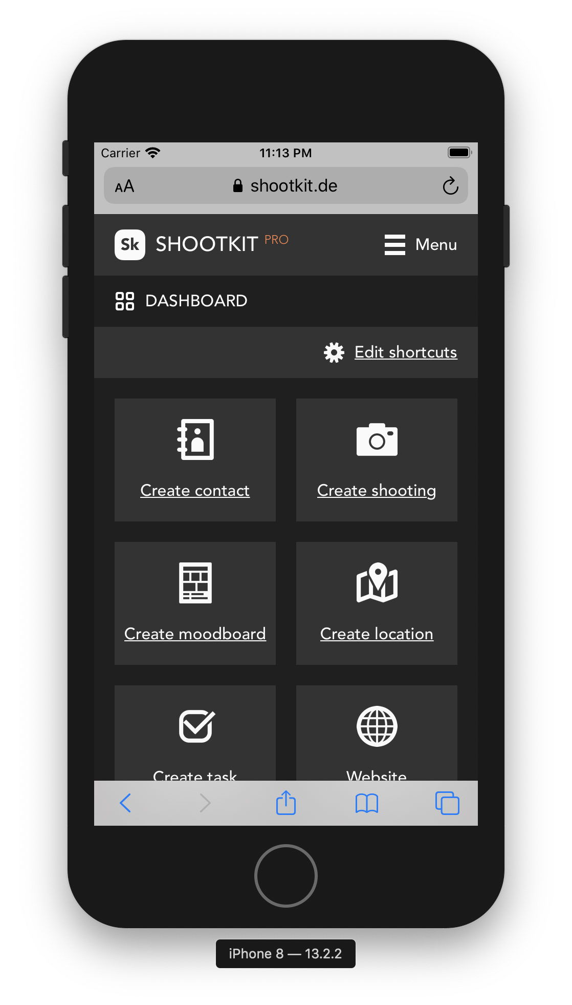 Shootkit kann als Webapp auf dem iPhone, iPad oder sonstigen mobilen Endgeräten installiert werden. Shootkit ist responsive gestaltet und bereits über den Browsern auf Mobilgeräte optimal abgestimmt. Der Funktionsumfang innerhalb der Webapp entspricht dem vollen Shootkit Funktionsumfang.