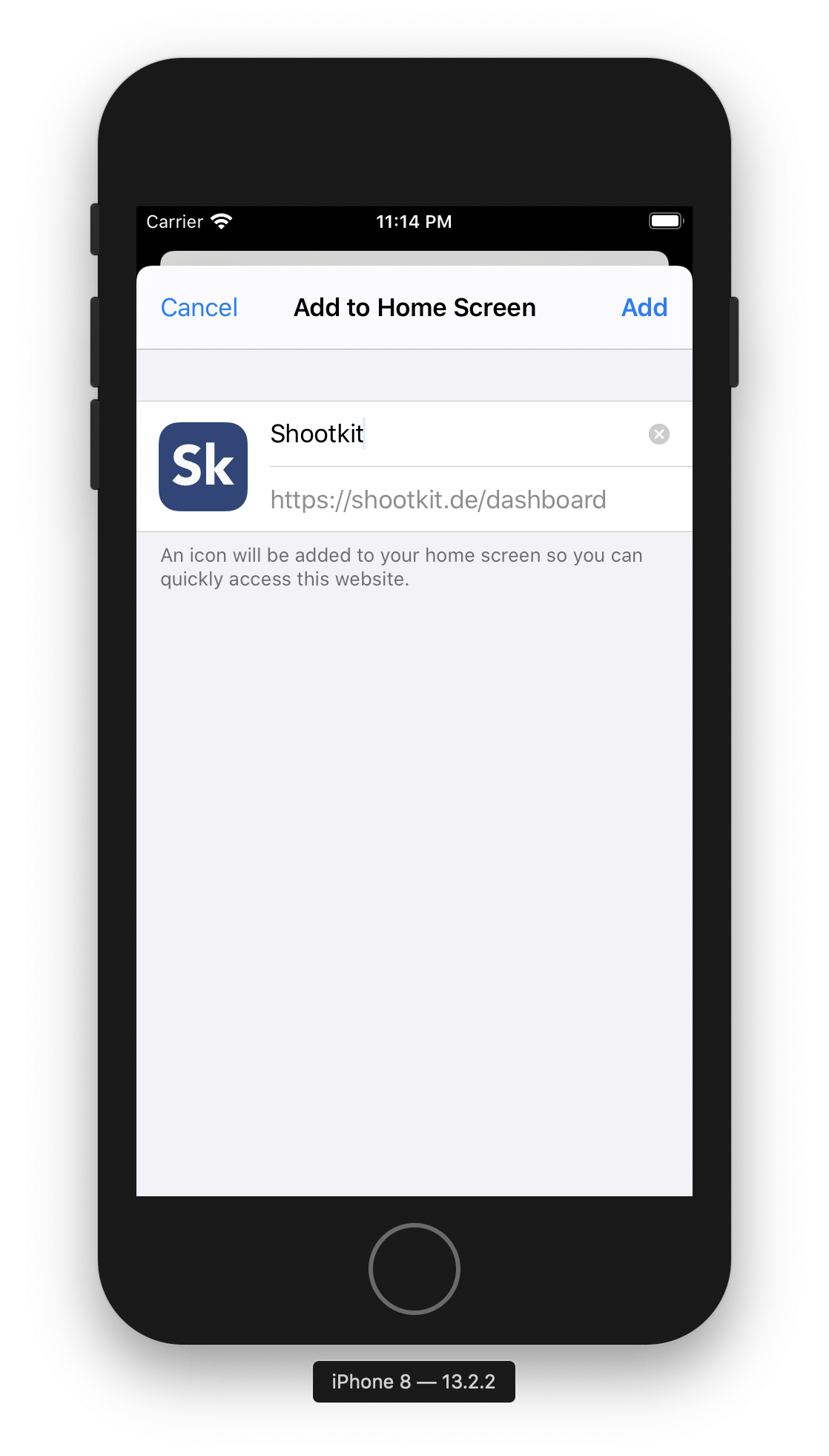Um die Shootkit Webapp unter iOS zu installieren, muss eine beliebige Seite von Shootkit in Safari geöffnet werden. So kann die Webapp beispielsweise aus dem Dashboard unter https://shootkit.app/dashboard installiert werden. Dazu muss in der Safari Menu Leiste das Teilen Menu geöffnet werden und anschließend “Zum Homescreen hinzufügen gewählt werden. Die Webapp wird durch Klick auf “hinzufügen” direkt mit Icon auf dem Homescreen installiert und kann dort anschließend wie eine normale App gestartet werden.
